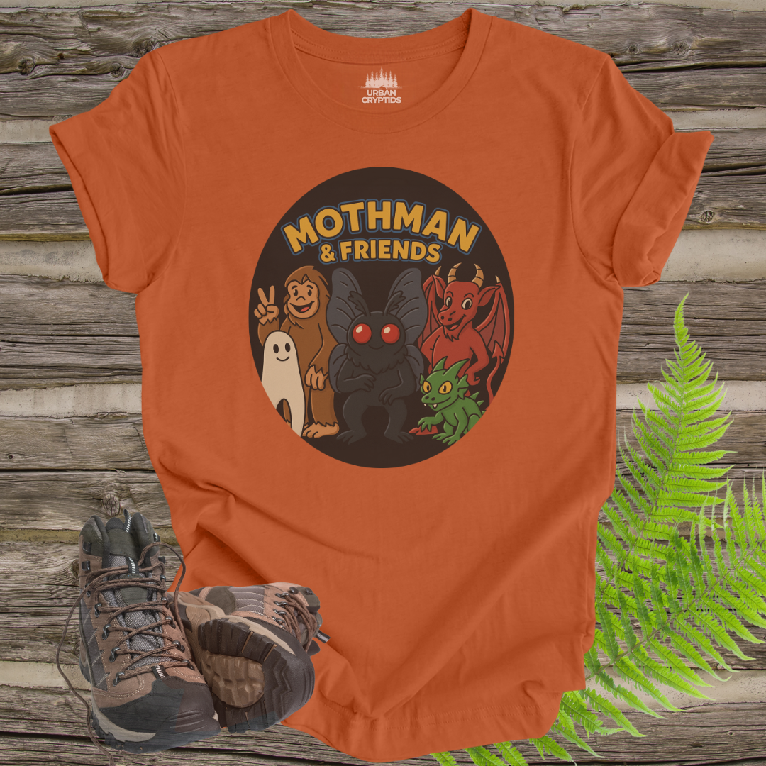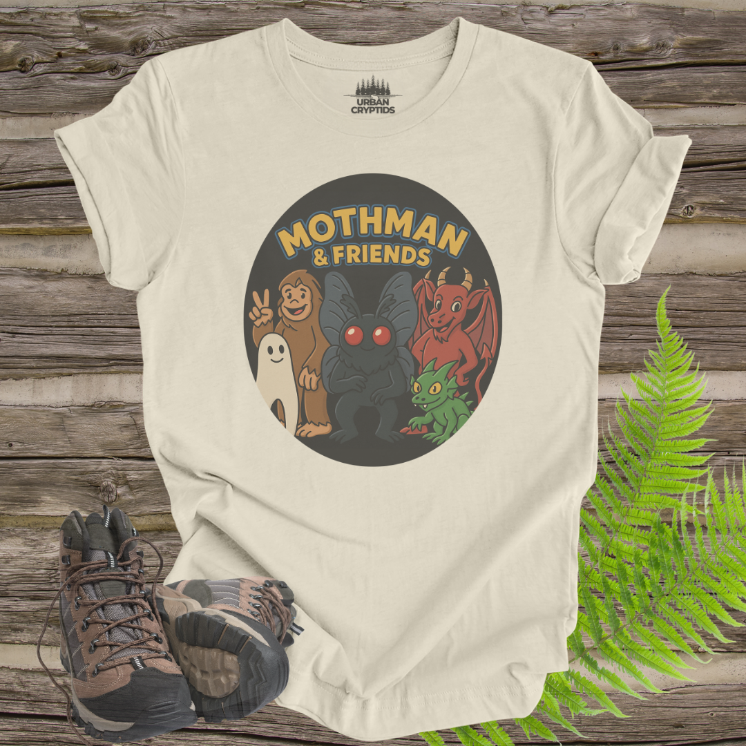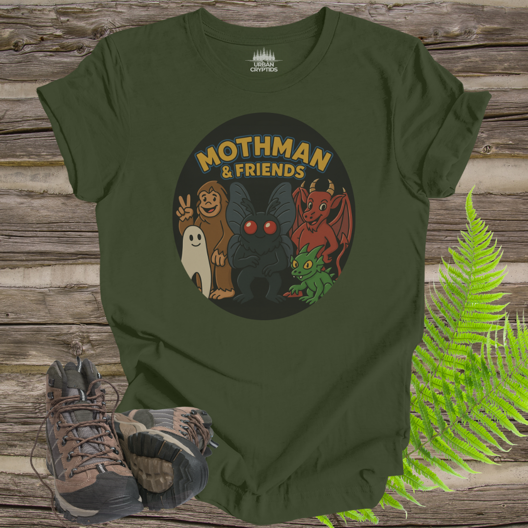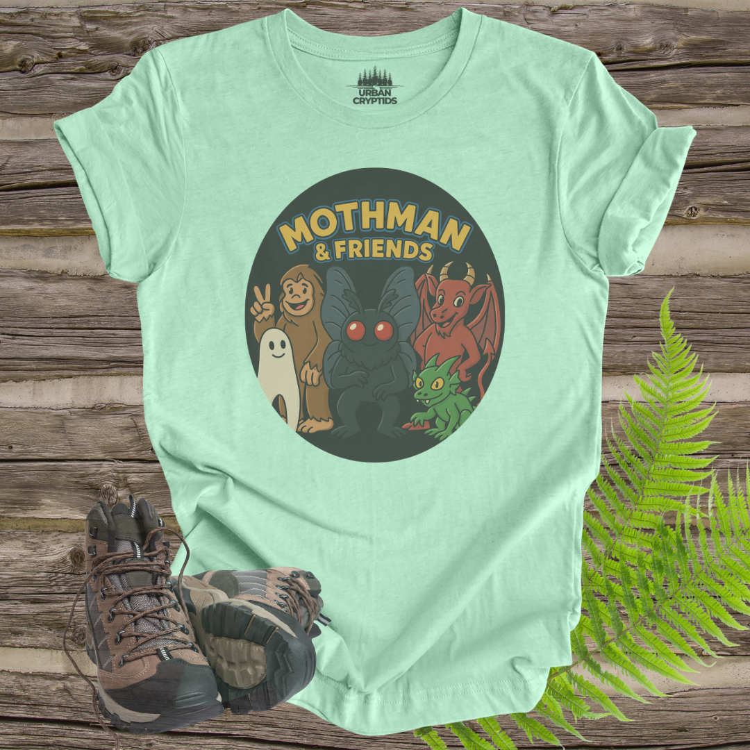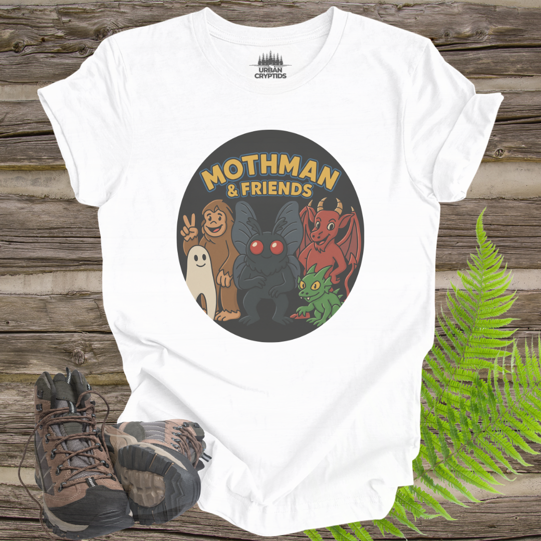 This cute cartoon T-shirt features Moth man and friends, including bigfoot, the new jersey devil, the Lochness monster, and a chupacabra. Perfect for those who love mythical creatures and cryptids, this T-shirt adds a fun and whimsical vibe to any outfit. Ideal for casual wear or as a gift for cryptozoology enthusiasts and fans of urban legends. Great for Halloween, cosplay events, and comic conventions.