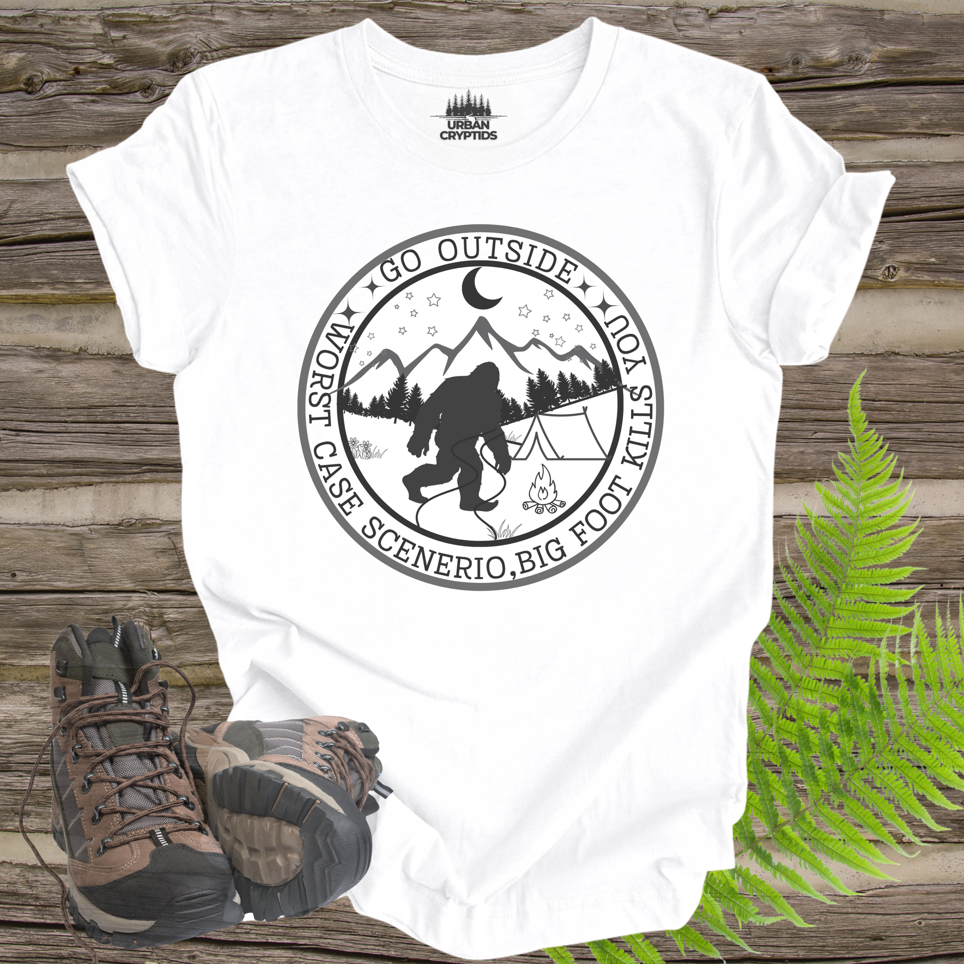 Funny Bigfoot Tee – “Go Outside, Worst Case Scenario Bigfoot Kills You” Shirt