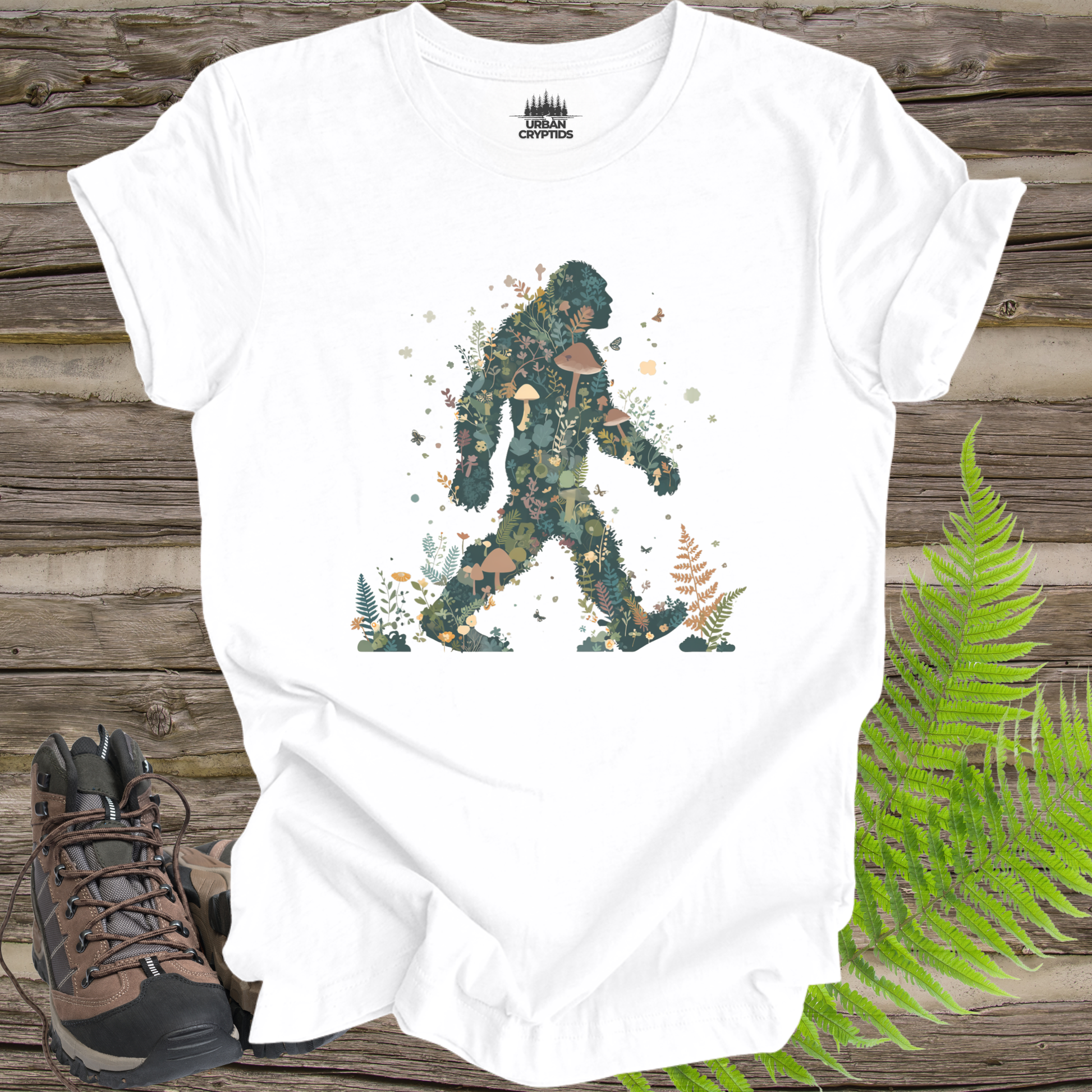 This nature-inspired cryptid T-shirt features a walking Bigfoot silhouette made from mushrooms, forest plants, and woodland textures, creating a unique design that feels both mysterious and grounded in the outdoors. Inspired by the idea of Sasquatch moving quietly through the wilderness, this shirt combines cryptid folklore with earthy nature vibes.