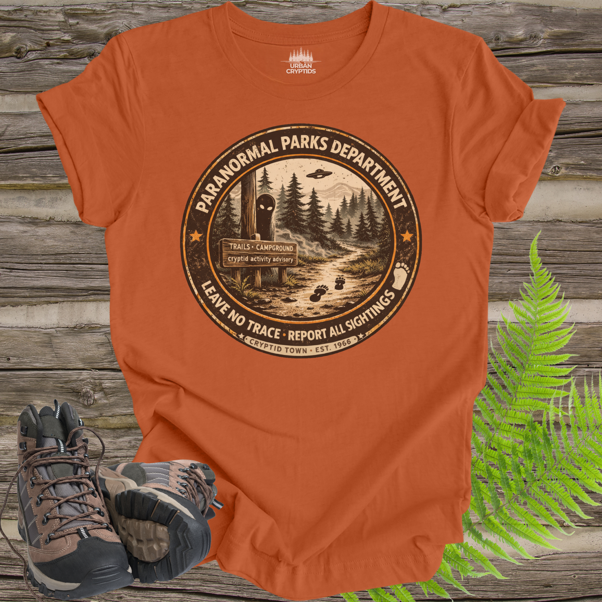 Paranormal Parks Department Shirt | Cryptid Town Tee | Leave No Trace Report All Sightings Vintage Ranger Badge
