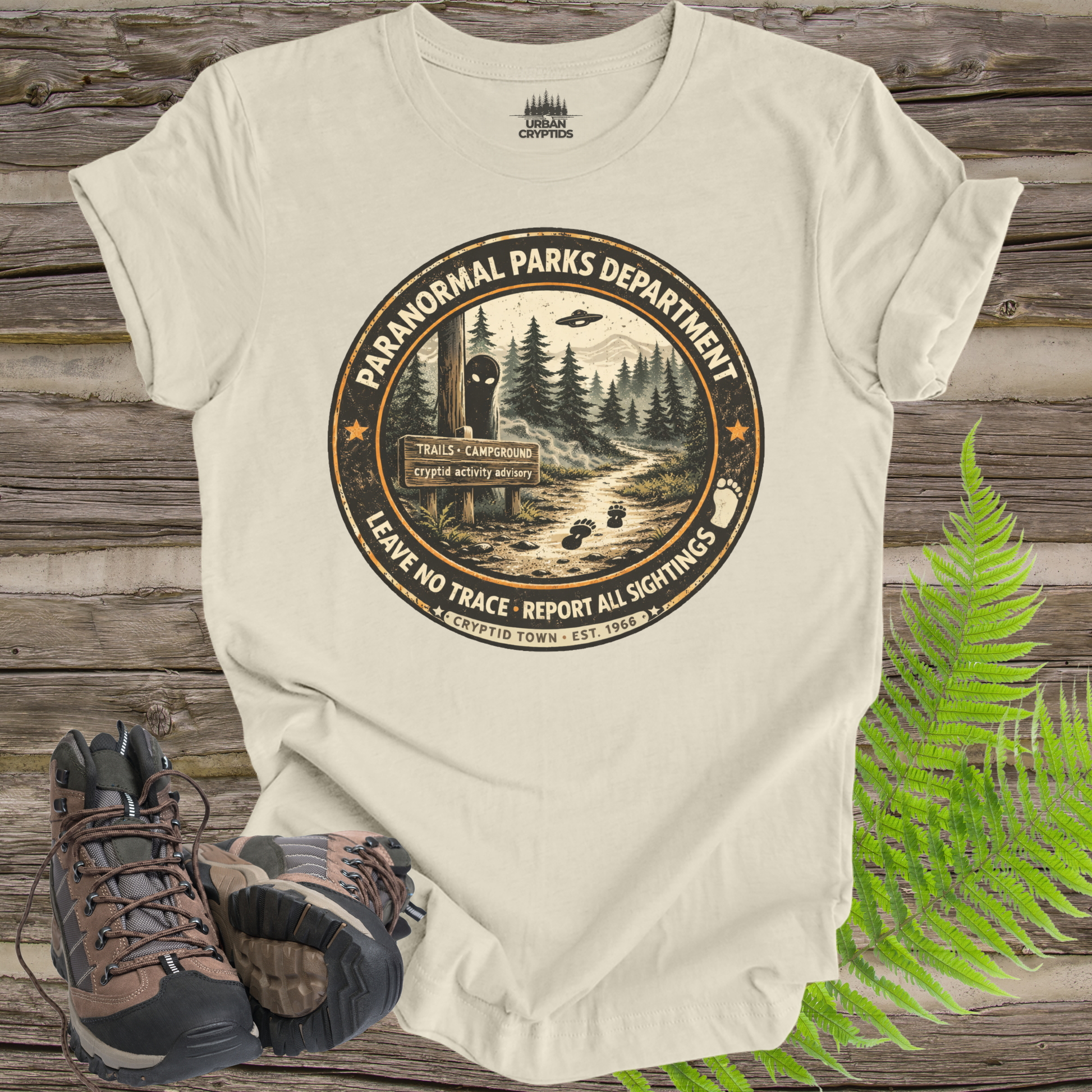 Officially unofficial. The Paranormal Parks Department keeps Cryptid Town’s trails… strange. This vintage ranger-style badge design features a shadowy forest scene, alternating footprints, and subtle paranormal detail—perfect for hikers, campers, park lovers, and cryptid believers. Clean negative space makes it super wearable while still feeling eerie and fun.