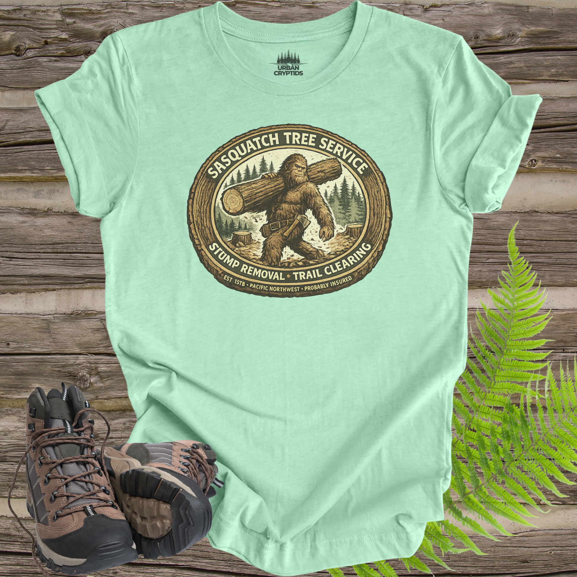 Sasquatch Tree Service Shirt | Cryptid Town Tee | Bigfoot Lumberjack Vintage Badge Stump Removal Trail Clearing