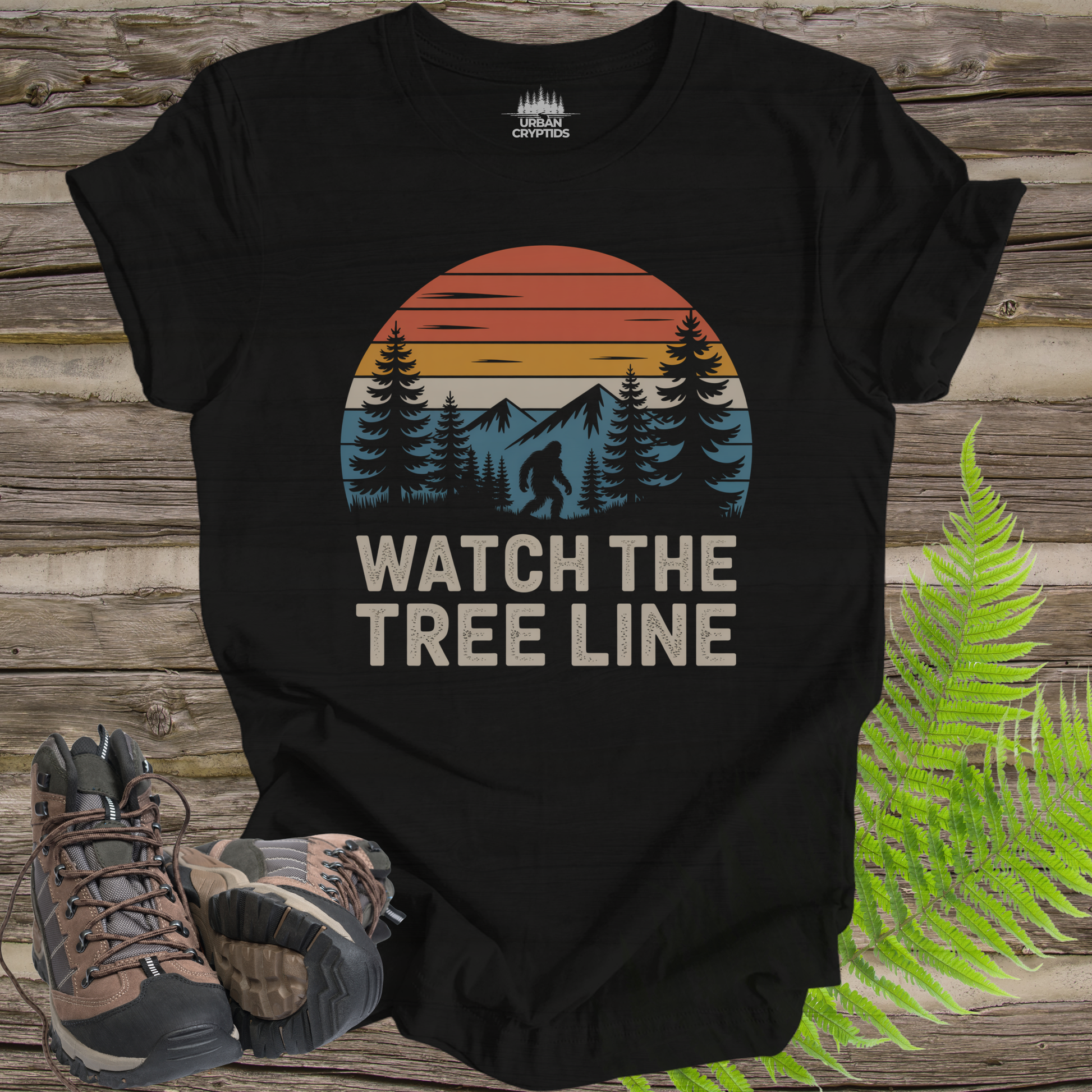 The “Watch the Tree Line” tee captures that eerie moment every hiker knows — when the forest goes quiet and you can’t help but scan the edge of the trees. Featuring a retro sunset forest scene and a subtle Sasquatch silhouette, this shirt is perfect for believers, hikers, and cryptid enthusiasts alike.